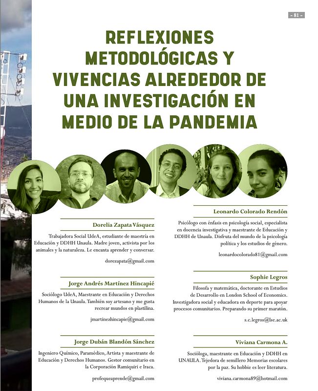Legros, S., Agudelo, V. C., Hincapié, J. A. M., Rendón, L. F. C., Vásquez, D. K. Z., & Sánchez, J. D. B. (2023). Methodological reflections and experiences from research during the pandemic (in Spanish). Pluriverso, 18(18), 213–241. https://doi.org/10.24142/pluriverso.n18a9